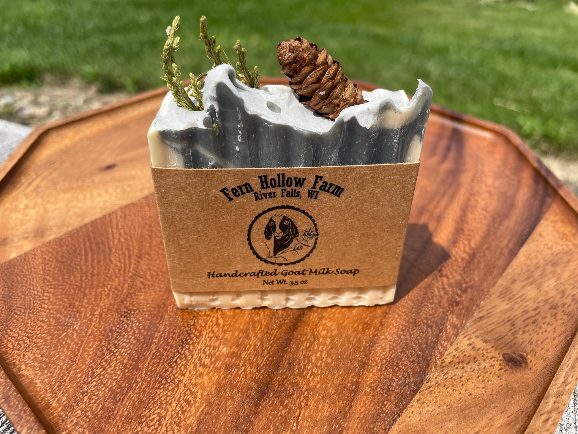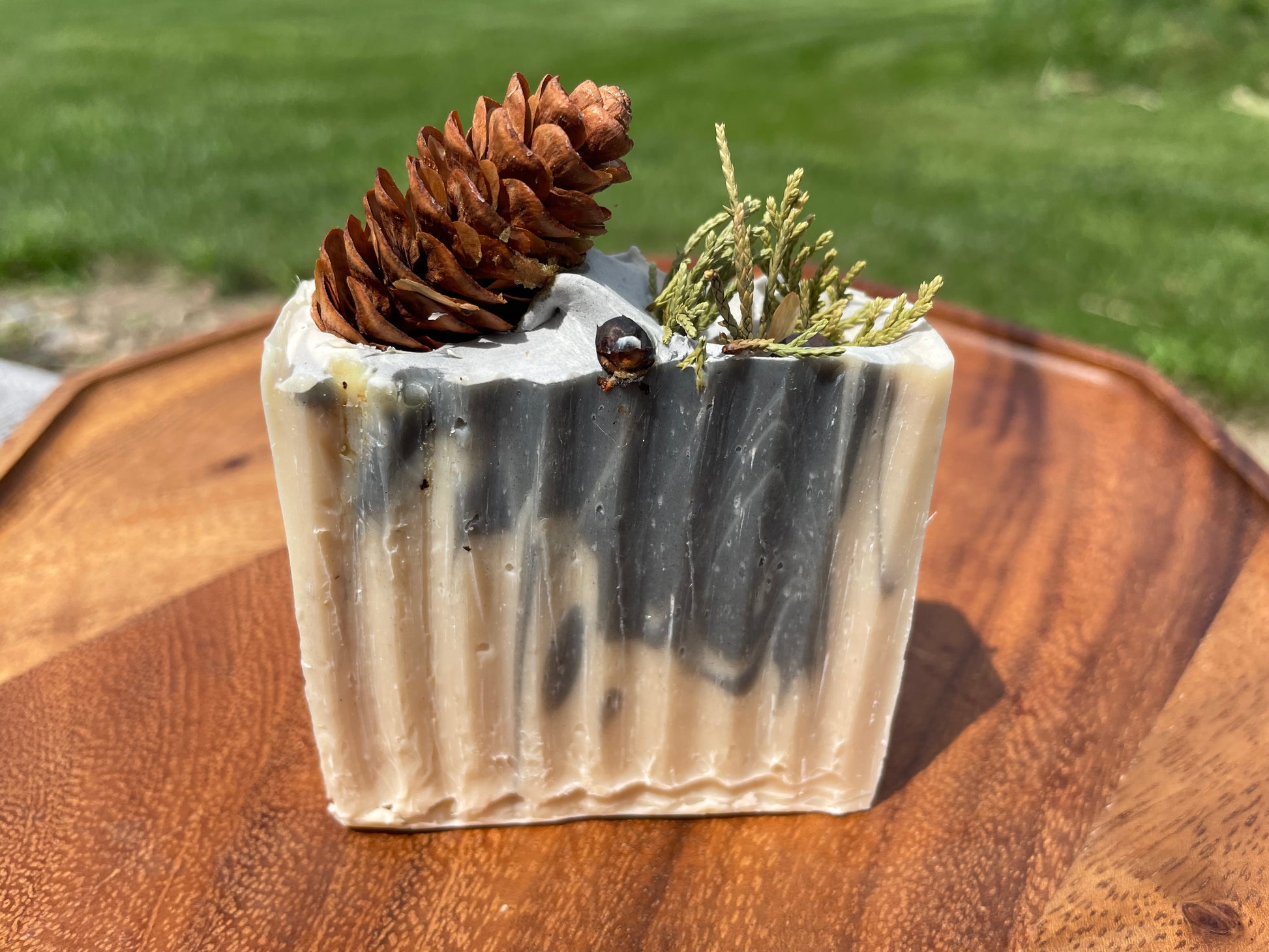 Ingredients: Olive Oil, Lard, Coconut Oil, Goat Milk, Water, Sodium Hydroxide, Fragrance Oils, Activated Charcoal, Titanium Dioxide, Cedar Needles, Cedar Berries, Spruce Needles, Pinecone (Net Wt. 3.5 oz)